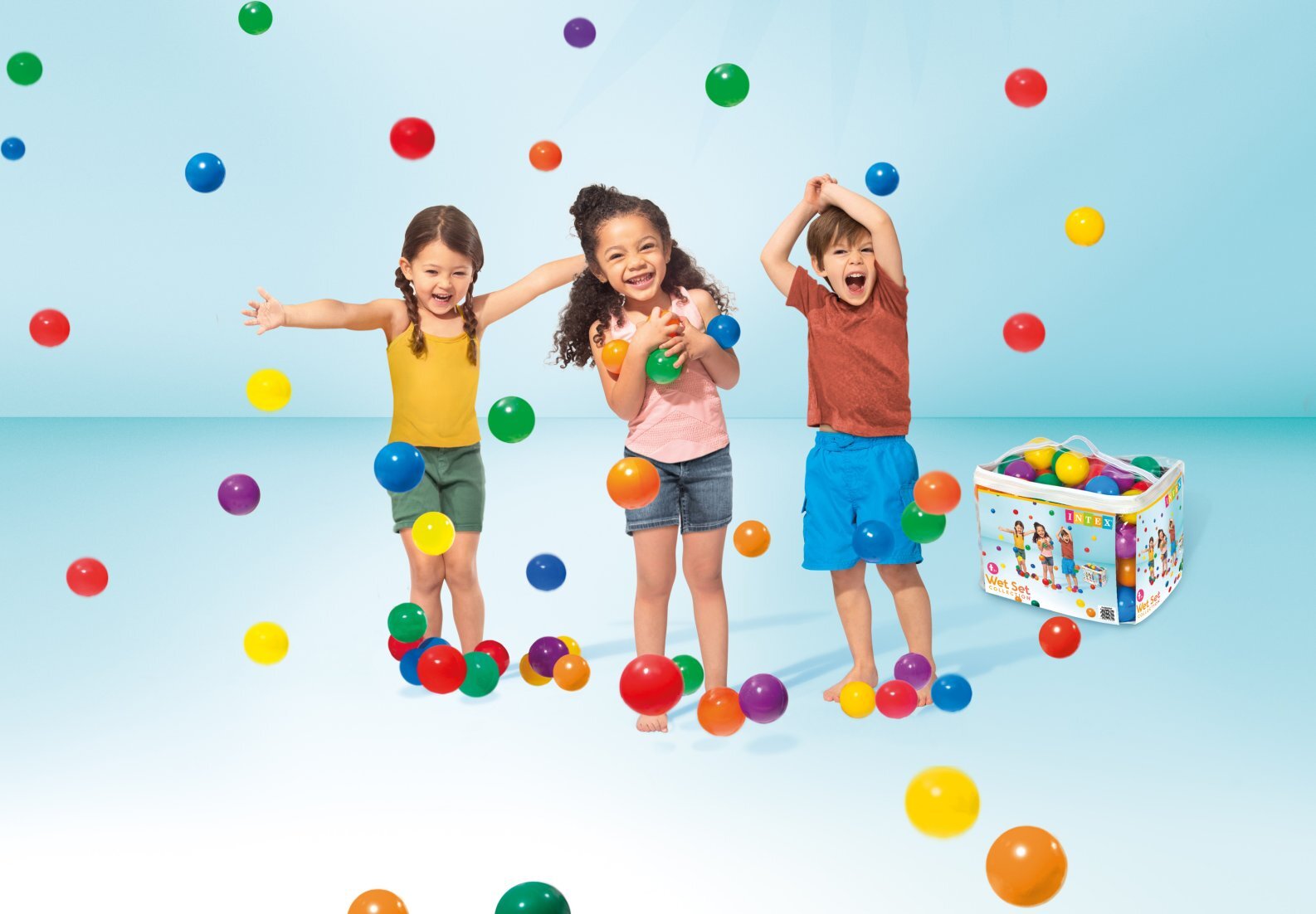 - 100 шарени топки во црвена, зелена, сина, жолта, портокалова и виолетова боја ќе ја разубават играта на вашето дете. (Производот треба да се користи под надзор на возрасно лица)